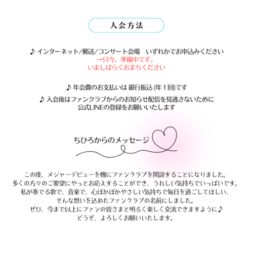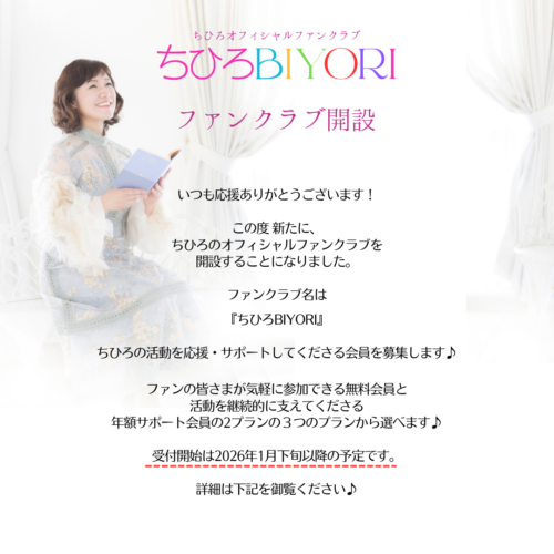 Newsニュース 12/21 ちひろオフィシャルファンクラブ開設のお知らせ♪ 2025/12/21 本日、ちひろの誕生日12月21日に ちひろオフィシャルファンクラブ「ちひろBIYORI」 を開設いたしました♪ お申込み受付は2026年1月下旬以降を予定しています☆彡 楽しみにお待ちくださいませ♪